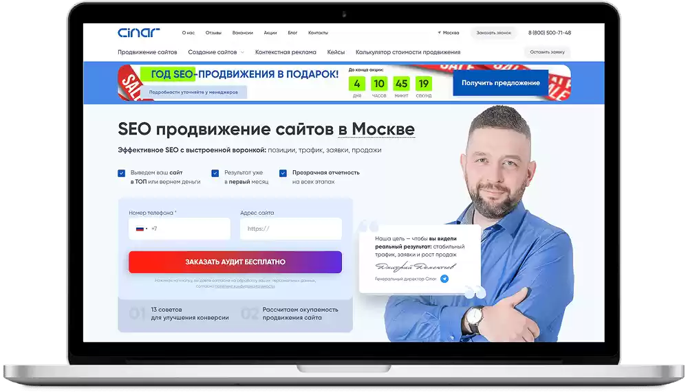 Cinar – это цифровое маркетинговое агентство полного цикла, работающее с 2013 года и предлагающее комплекс услуг: создание сайтов, SEO-продвижение (с гарантией результата)