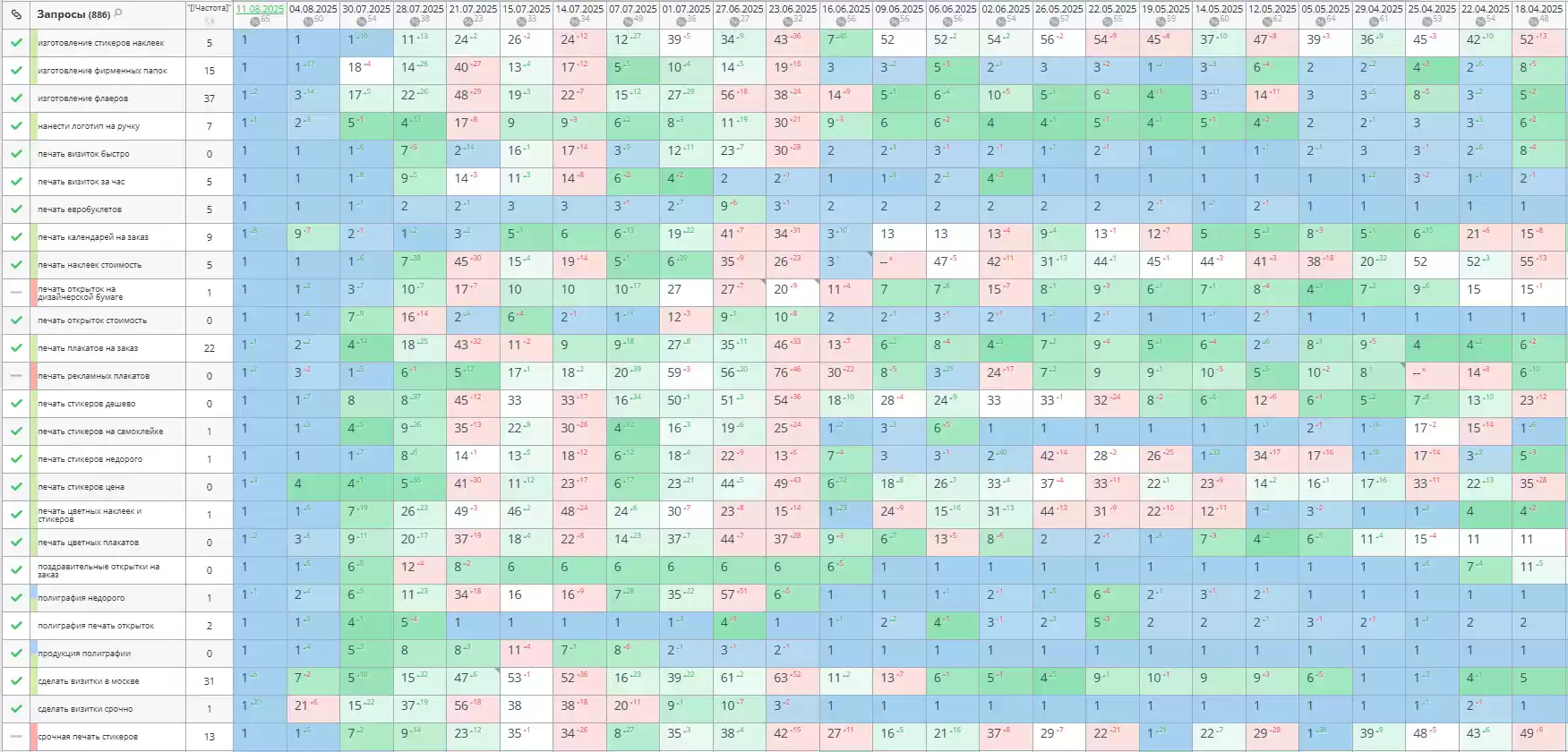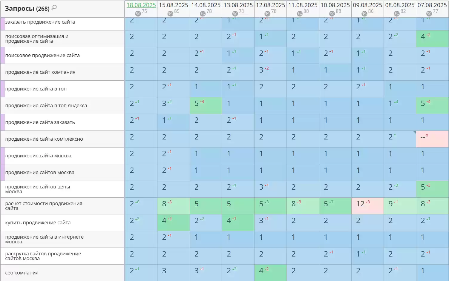 Мониторинг AI-видимости Отслеживаем упоминания и цитирование в ChatGPT, YandexGPT, Perplexity и других нейросетях. Сравниваем динамику с конкурентами и фиксируем рост.